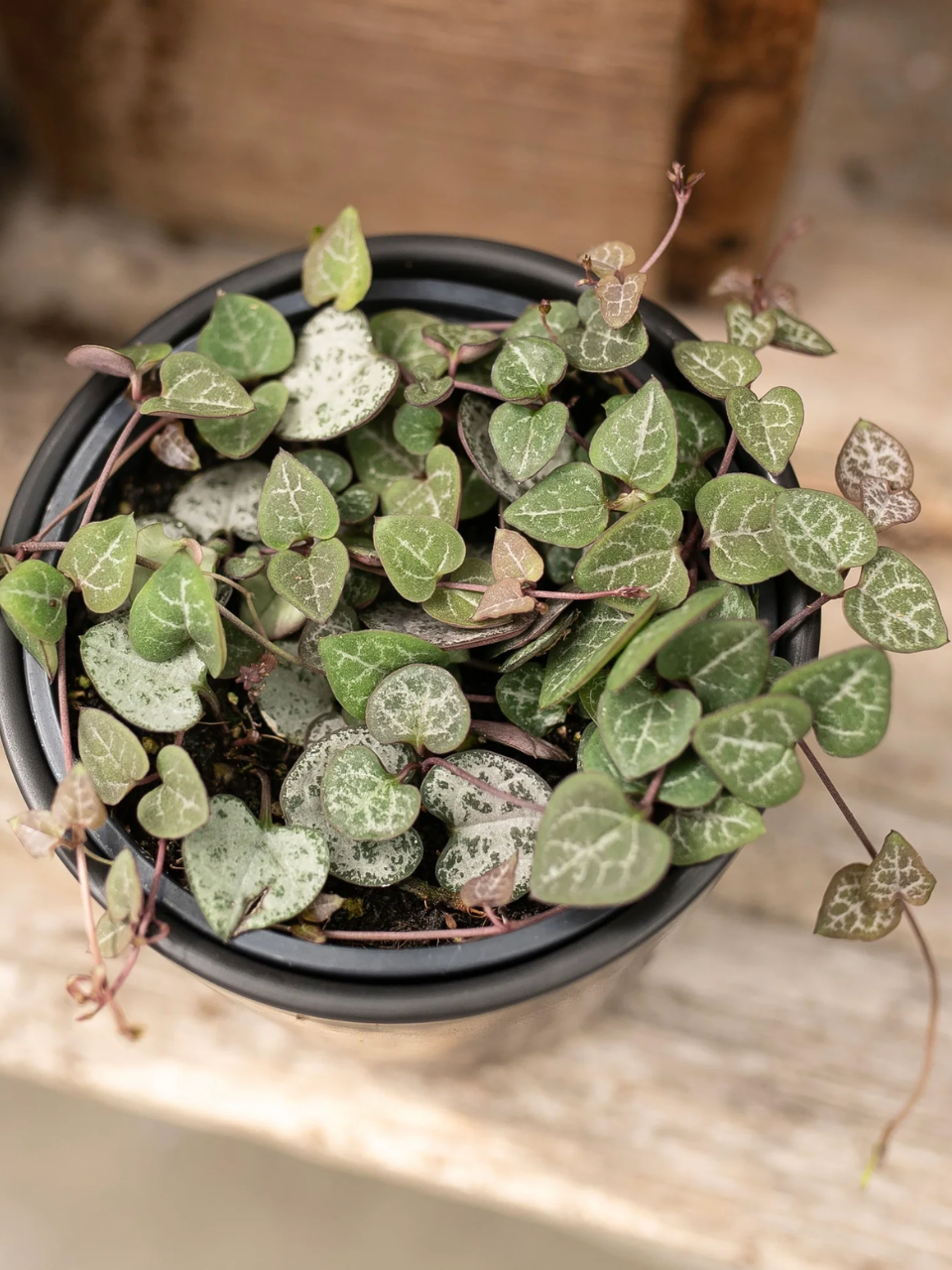 6️⃣ String of Hearts (Ceropegia woodii) – A beautiful trailing succulent with heart-shaped leaves and purple stems, perfect for hanging pots.